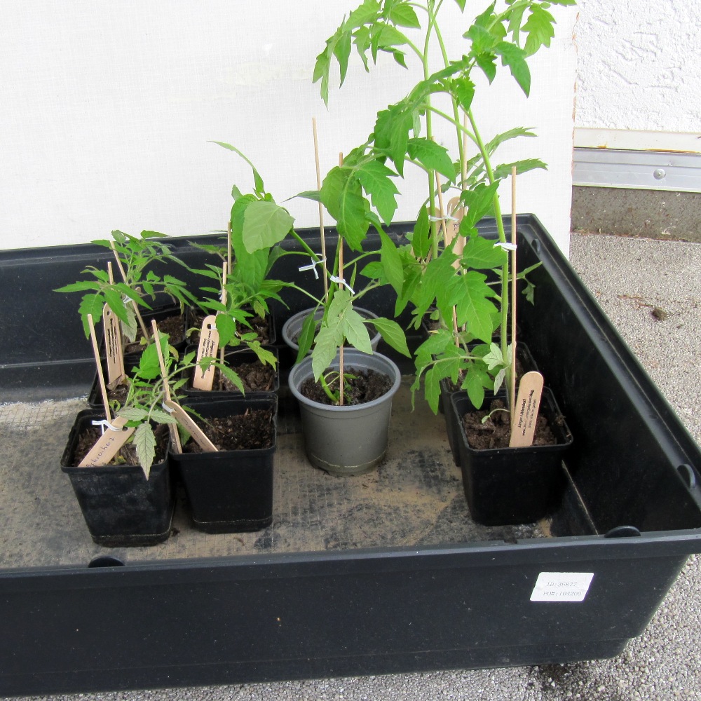 Je nach Aussaattermin sind die Tomaten inzwischen zwei oder drei Mal umgetopft. Für die Aussaat nutze ich Sämlingshäuser mit 7 × 7 Einzeltöpfchen. Das erleichtert mir das erste Umsetzen (Pikieren) der zarten Sämlinge. Für die zweite Stufe nutze ich 10 Trays, in denen ich einst Stiefmütterchen gekauft habe. Die Trays sind erstaunlich robust und ich nutze sie schon einige Jahre. Sobald die Pflanzen groß genug sind, kommen sie dann in eigene Töpfe von 7 oder 9 Zentimetern. Dann bekommen sie auch jede ihr eigenes Namensschild. Bei 50 Töpfen auf der Fensterbank ist die Verwirrung sonst vorprogrammiert.