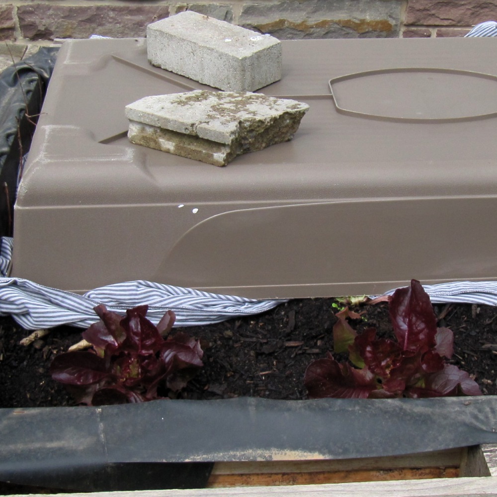 Für drei Nächte der letzten Woche waren –4 °C angesagt. Ich habe die Mehrzahl der Salatköpfe mit einem großen Baumwolltuch abgedeckt und zusätzlich einer großen Plastikschale geschützt.