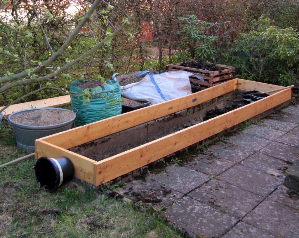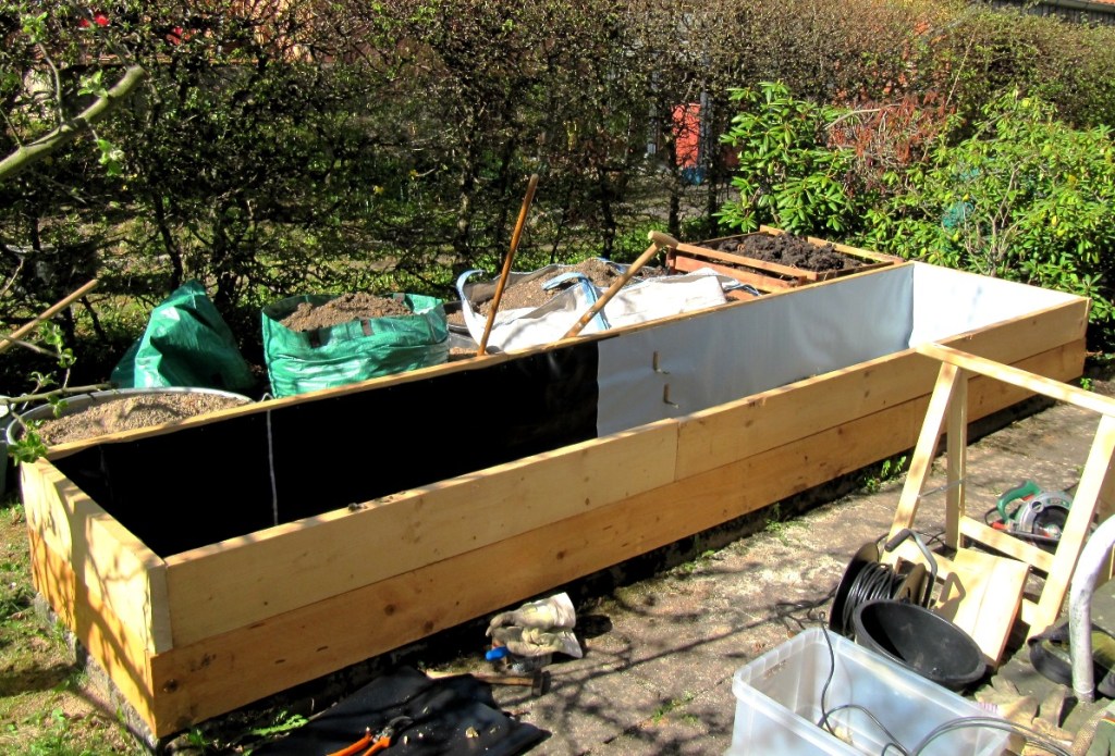 Größe und Form geben der mit Rasenkantensteinen eingefasste Bereich des Gemüsebeetes vor. Innerhalb dieser Fläche hebe ich die Erde spatentief aus und verteile sie auf alle Arten von Vorratsgefäßen, die ich finden kann. Die Wände des Hochbeetes baue ich dann mit stabilen Brettern. Die Rasenkantensteine und das nun vorhandene Loch sind eine gute Hilfe bei der Montage der ersten Runde an Brettern. Nach einer zweiten Runde an Brettern und einer Höhe von etwa 50 Zentimetern bespanne ich die Innenseite des Hochbeetkastens mit Teichfolie. Die Bretter sind zwar von beiden Seiten mit Holzschutz eingestrichen, doch ich bin mir nicht sicher, ob das als Schutz gegen jahrelange intensive Nässe der Hochbeeterde ausreicht.