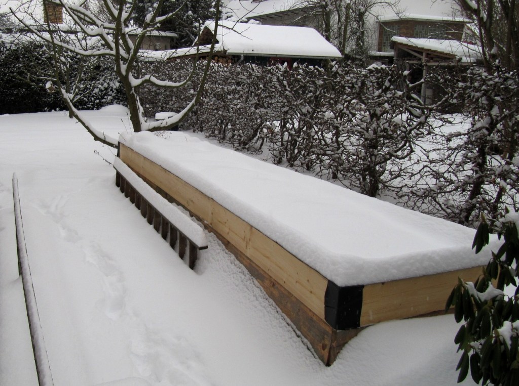 Das Gartenjahr ist zu Ende und die entstehende Wärme durch das Verrotten des halbreifen Kompostes wird keiner Pflanze zu gute kommen. Doch ich möchte die Arbeiten abschließen und für das nächste Gartenjahr startklar sein. Pflanzen setze ich keine mehr ein, das fange ich im nächsten Frühjahr ganz neu an. Was zuvor an ausdauernden Pflanzen im Hochbeet war oder im Frühjahr hinein soll, pflanze ich provisorisch in Töpfe, die ich eingrabe. Kurze Zeit später liegt eine dicke Schicht Schnee über dem Beet und alles an Ideen und Plänen ruht bis zum nächsten Frühjahr.