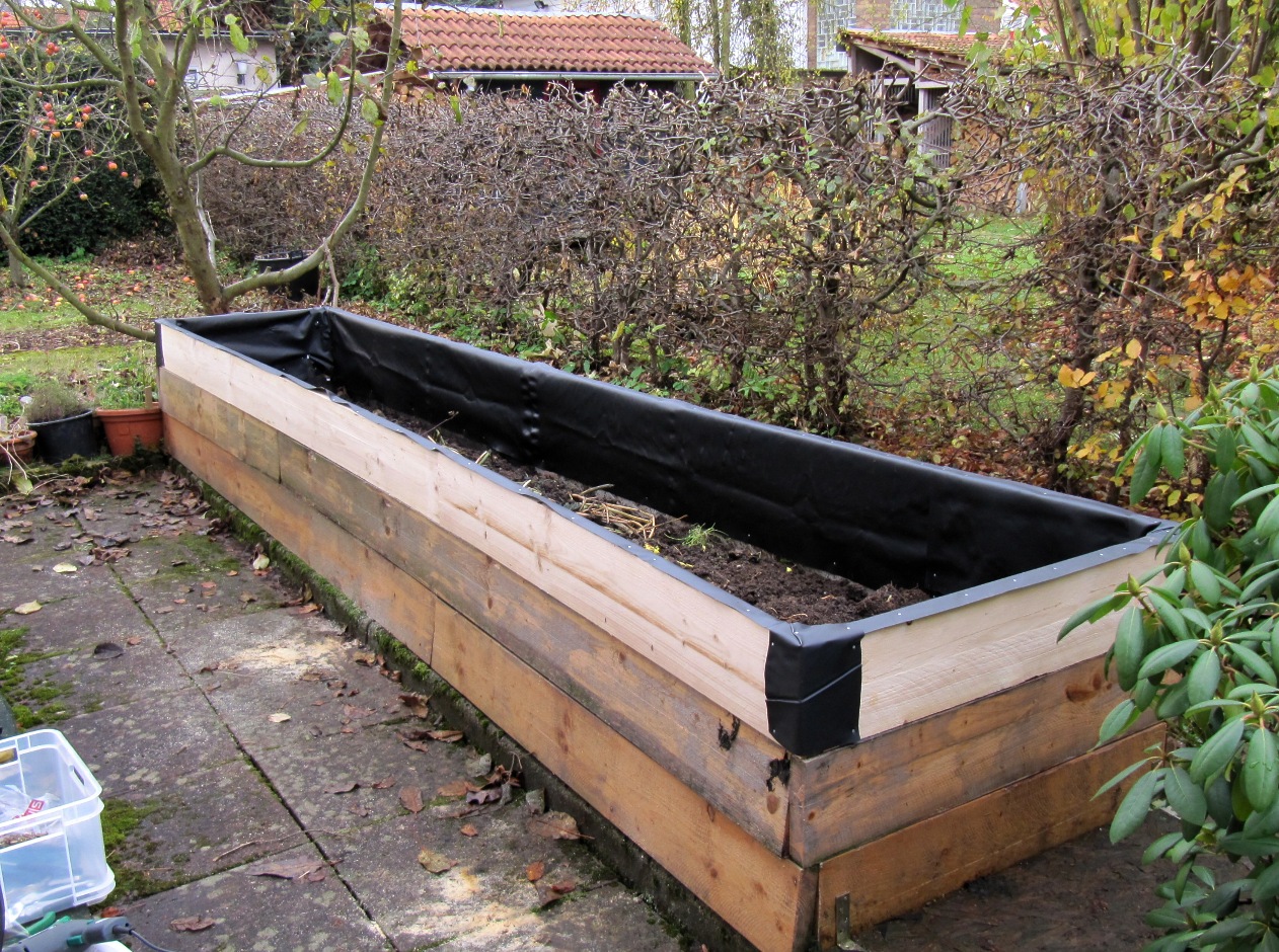 Größe und Form geben der mit Rasenkantensteinen eingefasste Bereich des Gemüsebeetes vor. Innerhalb dieser Fläche hebe ich die Erde spatentief aus und verteile sie auf alle Arten von Vorratsgefäßen, die ich finden kann. Die Wände des Hochbeetes baue ich dann mit stabilen Brettern. Die Rasenkantensteine und das nun vorhandene Loch sind eine gute Hilfe bei der Montage der ersten Runde an Brettern. Nach einer zweiten Runde an Brettern und einer Höhe von etwa 50 Zentimetern bespanne ich die Innenseite des Hochbeetkastens mit Teichfolie. Die Bretter sind zwar von beiden Seiten mit Holzschutz eingestrichen, doch ich bin mir nicht sicher, ob das als Schutz gegen jahrelange intensive Nässe der Hochbeeterde ausreicht.