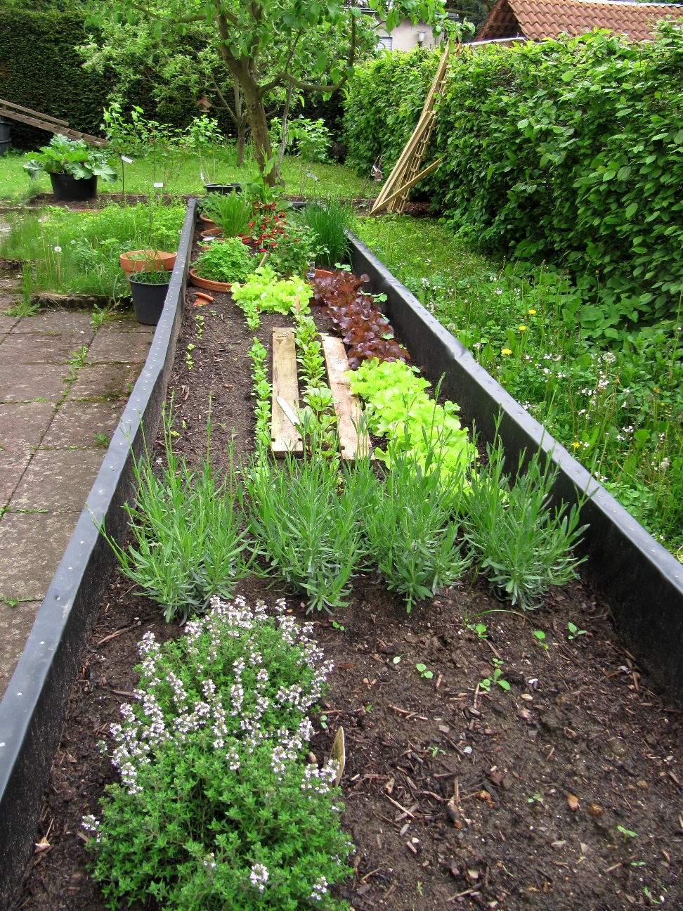 Beim zweiten Anlauf gelingt die Bepflanzung besser als in der ersten Runde. Es gibt zwar wieder etwas Dekoration, aber insgesamt ist es nun ein Saison- und Salatbeet. Auch an das Absacken bin ich mich inzwischen gewöhnt. Sobald eine Reihe Salat abgeerntet ist, füllte ich etwas Erde nach, bevor ich neu säe oder pflanze. Obwohl das Hochbeet nicht überdacht ist – es müsste also überall genauso viel regnen – ist das rechte Viertel deutlich trockener als der Rest. Ich gestalte dort eine mediterrane Ecke aus Thymian und Lavendel. Später kommt noch ein Rosmarin dazu, der zwei Winter gut übersteht, bis der dritte dann leider zu kalt ist. Es ist ein Experiment, wie so vieles andere im Garten auch. Wenn ich wieder einen Rosmarin kaufe, werde ich ihn in einen Kübel setzen und zusammen mit dem Ananas-Salbei ins Winterquartier bringen.