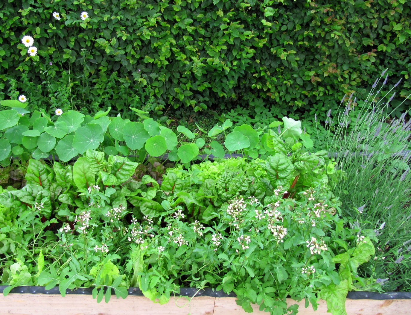 Im zweiten Sommer nach der Erhöhung wuchert es so arg, dass ich für kurze Zeit den Überblick verliere. Ich hatte einen Versuch mit Wirsing gewagt und gleichzeitig Gänsefingerkraut angesiedelt. Als dann in meinem Brotberuf so viel zu tun ist, dass ich zwei Wochen nicht dazu komme, in den Garten zu gehen, wird aus dem Hoch- ein Wimmelbeet. Pasta und Pizza haben daher jetzt Pause und es gibt jeden Tag eine Schüssel voll Salat! Trotz Wimmelbeet zeigt sich nun einer der Vorteile des Hochbeetes. Die beiden ebenerdigen Gemüsebeete werden in den wenigen Wochen ohne beständige Pflege vom Giersch überrannt. Im Hochbeet wuchert zwar das Gänsefingerkraut kräftig durch alle Lücken, aber es wird einfach des Platzes verwiesen und durch Pimpinelle ersetzt. Der aufgegessene Salat macht Platz für späte Mangoldsetzlinge. Und weiter geht es mit der nächsten Runde aus säen, experimentieren und aufessen!