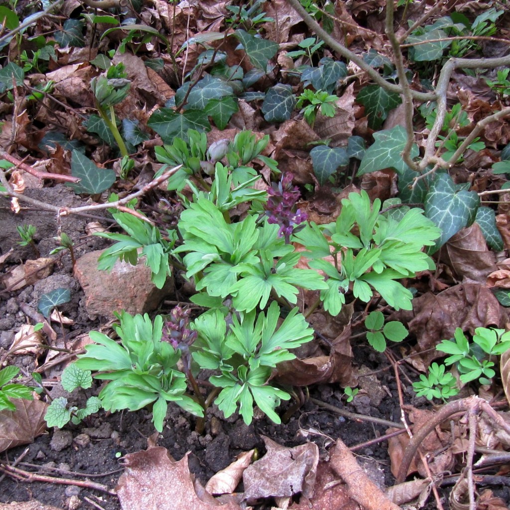Auch dies wieder so ein Eindruck von mir als Mensch. Grün ist es an und unter allen Hecken. An der West-Hainbuche wachsen diejenigen Pflanzen, die ich benennen kann. Im Februar sind es ein paar Schneeglöckchen zwischen welkem Herbstlaub und allerlei Unkrautgrün. Im März wird der Boden bunt vor Lerchensporn und Scharbockskraut. Danach übernimmt der Giersch das Regiment für den Rest des Jahres. Vieles andere von Knoblauchsrauke bis Tränendes Herz lässt sich ebenfalls blicken. Doch selbst ein kräftiger Busch Brennnesseln wird im Sommer von Gierschblüten überwuchert.