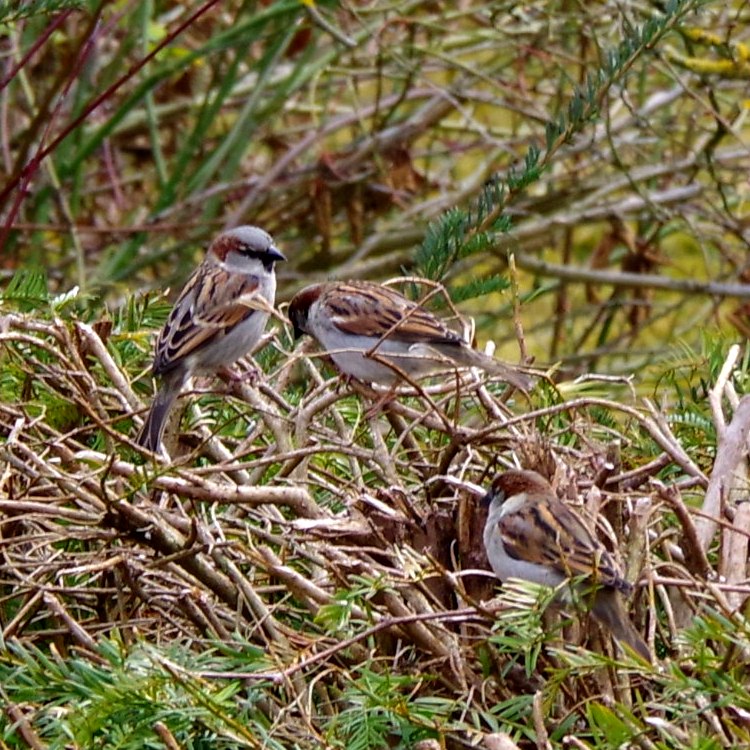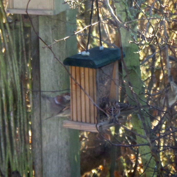 Im letzten Herbst hat sich eine Horde Spatzen dort niedergelassen. Wir freuen uns über jedes Tier, das sich in unserem Garten wohlfühlt. Hm, na ja, der Waschbär, der gelegentlich auf der Wildkamera zu sehen ist, ist nicht so ganz unser Favorit. Aber die Spatzen sind auf jeden Fall gerne gesehen. Sie setzen neue Maßstäbe, was Lebendigkeit und Lautstärke angeht. Die Amseln wirken plötzlich viel leiser als in den anderen Jahren. Einige Tauben sitzen oft in der Ulme vor der Hecke. Sobald die Spatzen genug Futter aus den Futterhäuschen geworfen haben, picken die Tauben es auf.