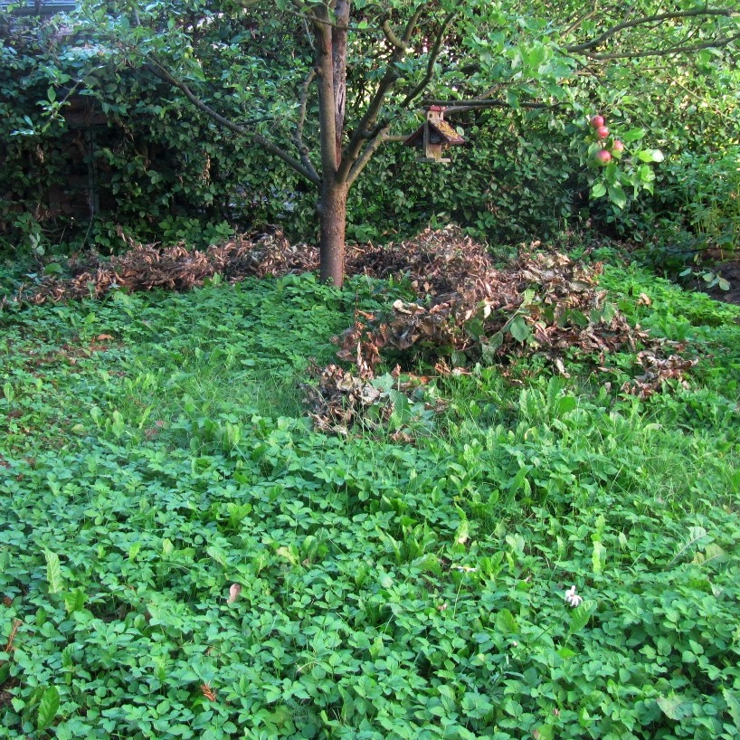 Um den Giersch in größeren Mengen für den eigenen Kompost nutzen zu können, starte ich ein Experiment. Ich schneide die Hainbuchenhecke, verteile den Heckenschnitt auf meiner „Gierschwiese“ und lasse ihn dort einige Tage liegen, damit das Laub dürr und trocken wird. Alles zusammen zerkleinere ich dann mit dem Rasenmäher. Das Ergebnis ist eine luftige Mischung aus trockener Hainbuche und feuchtem Giersch. Perfekt für den Komposthaufen!