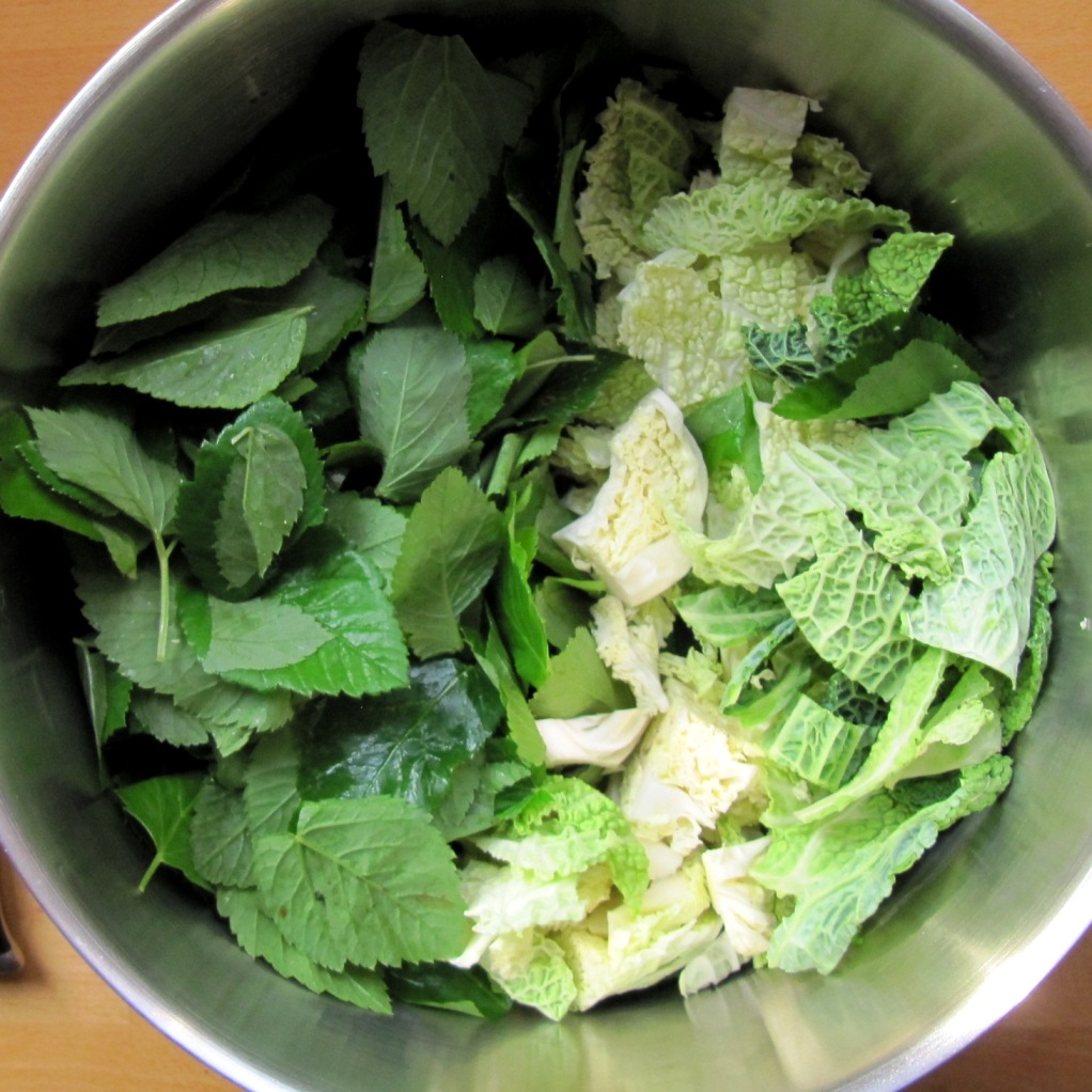 – Eine Schüssel Giersch und Brennnessel pflücken und waschen.