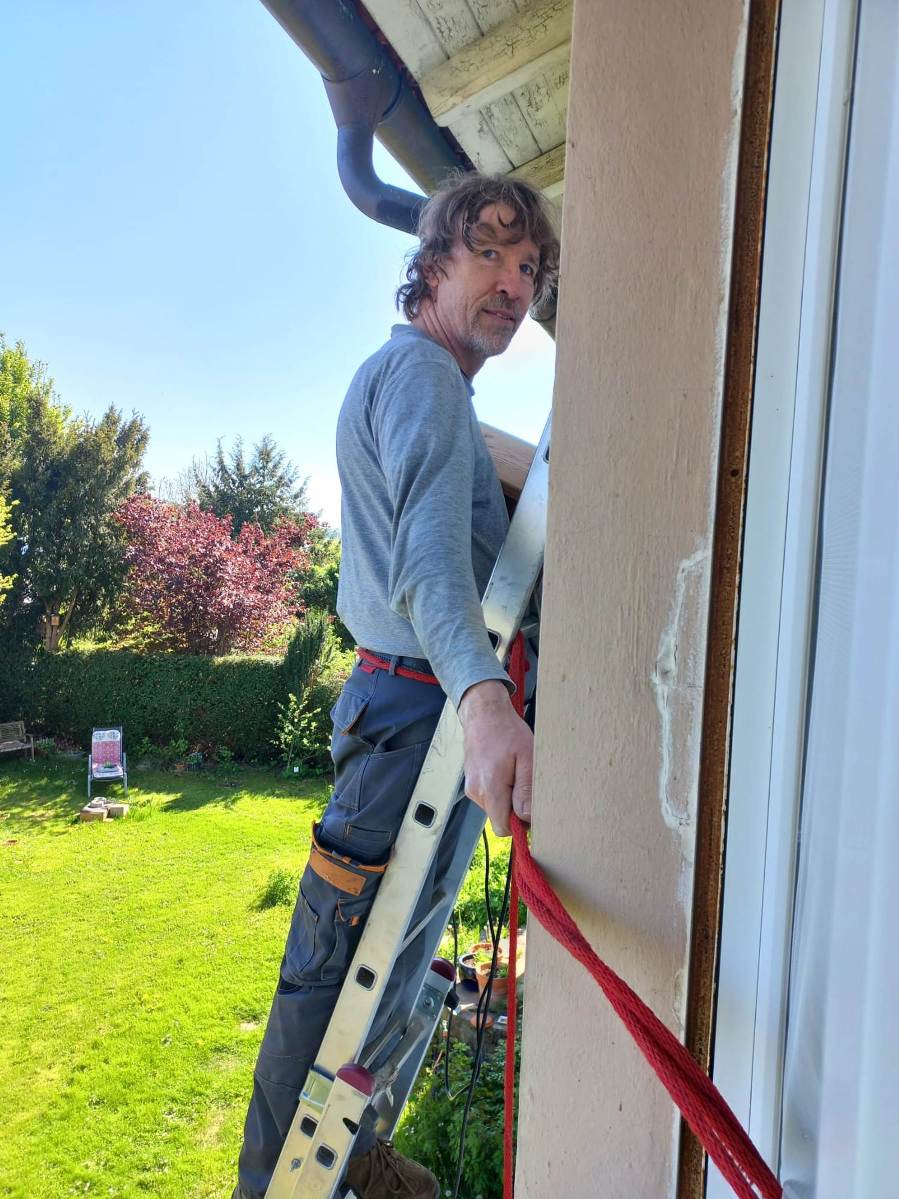 Ende April drängt die Zeit und ich wage mich an eine unkonventionelle Lösung. Die Leiter alleine ist nicht hoch genug. Der gefüllte Wassertank wiegt 1 Tonne und das Metallgestell ist dafür gedacht einen zweiten Wassertank tragen zu können. Ich stelle die Leiter also nicht auf die Erde, sondern auf den Wassertank. Es ist für mich immer noch alles recht wacklig. Daher befestige ich die Leiter zusätzlich an der Hauswand, bevor ich mit den Nistkästen beginne. Die Nistkästen sind zu groß und zu schwer, um sie auf der Leiter nach oben zu tragen. Ich ziehe sie also mit einem Seil nach oben, nachdem Dübel und Schrauben vorbereitet sind.