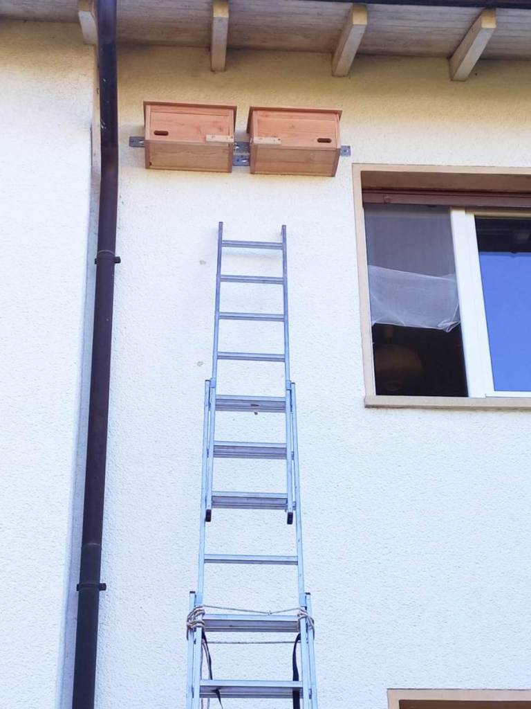 Nach allerlei Ausprobieren und auch ein paar Fehlversuchen gelingt es, zwei neue Nistkästen für Mauersegler anzubringen! Nachdem Leiter und Werkzeug weggeräumt sind, sieht es aus, als wären die Kästen schon immer da oben.