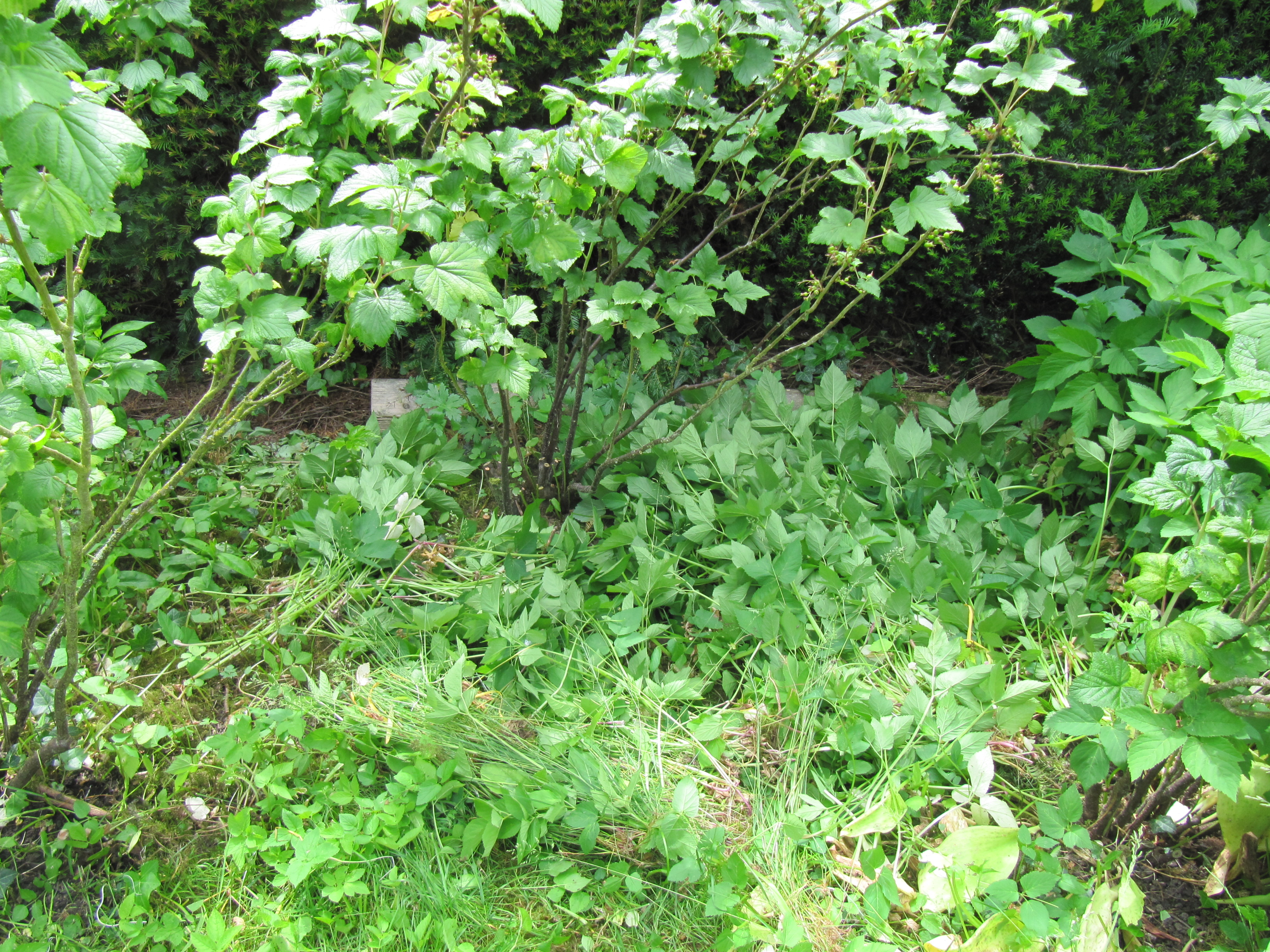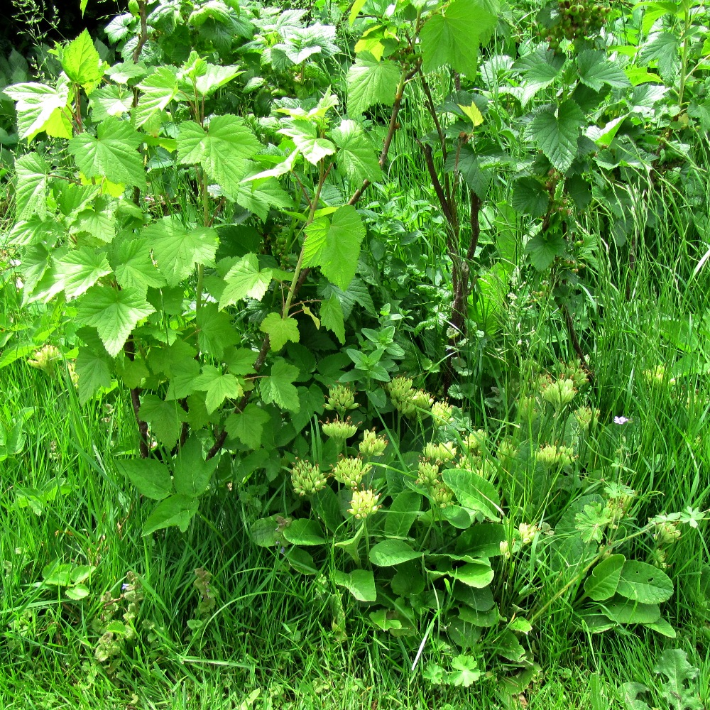 Im Laufe der Jahre ist die Wiese unter und zwischen den Johannisbeerbüschen zu einem Paradies für Frühblüher geworden. Dies hat leider auch der Giersch entdeckt. Kaum sind Winterlinge, Narzissen, und Schlüsselblumen verblüht, sprießen die ersten Gierschblätter aus dem Boden. Natürlich wächst der Giersch viel schneller als Schneeglöckchen & Co ihre Blätter einziehen. Ich muss mich entscheiden, die Frühblüher zu schonen, damit sie nächstes Jahr wieder blühen, oder den Giersch so früh wie möglich zu begrenzen. Natürlich funktioniert das nicht. Ich müsste von Hand, Woche für Woche jedes neue Gierschblättchen jäten.