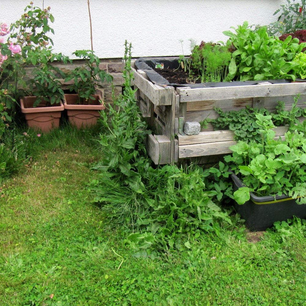 Eine Wegwarte, die am Hochbeet wächst. Oregano, der sich selbst am Fuß des Apfelbaums ausgesät hat. Weshalb sollte ich beide abmähen, ausstechen oder auf andere Zeit und Kraft investieren, um eine freundliche Pflanze zu verjagen? Im eigenen Garten lässt sich die Artenvielfalt allein durch Nichtstun unterstützen. Anstatt Arbeit in die Monokultur Rasen zu investieren, freue ich mich über neue Blüten und Pflanzen, die sich selbst einen Platz suchen. Manche der wilden Ecken bleiben das ganze Jahr über stehen. Manche nur ein paar Wochen.