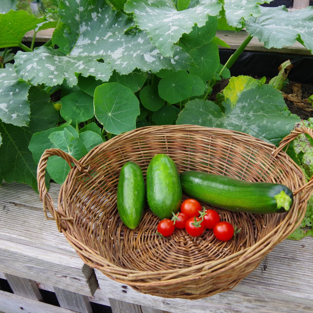 Die Gurken habe ich sehr spät ins Freiland gesetzt. Die Nachttemperaturen lungerten fast den gesamten Mai bei 5 Grad herum. Das wollte ich den kälteempfindlichen Pflanzen nicht zumuten. Daher bin ich auch bei den Gurken überrascht, dass ich schon im Juni ernten kann.