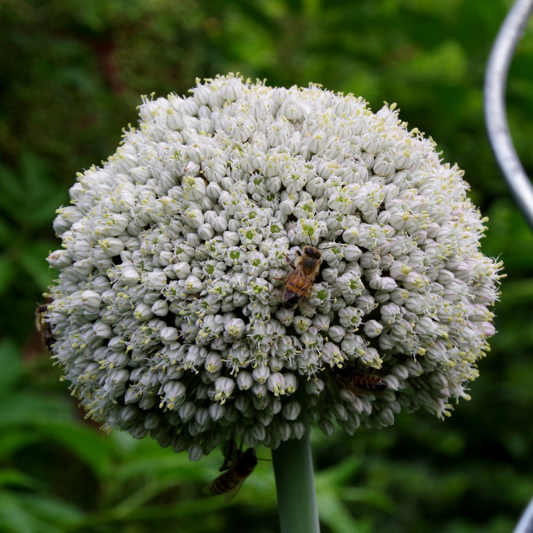 Mittlerweile blüht der Lauch endlich. Die Blüte sieht dem Zierlauch sehr ähnlich, ist allerdings „nur“ weiß und nicht so bunt wie der Zierlauch. Die Blüte ist bei Wildbienen sehr begehrt. Selbst abends nach acht, wenn es im Lavendel langsam ruhig wird, sitzen noch Bienen im Lauch.