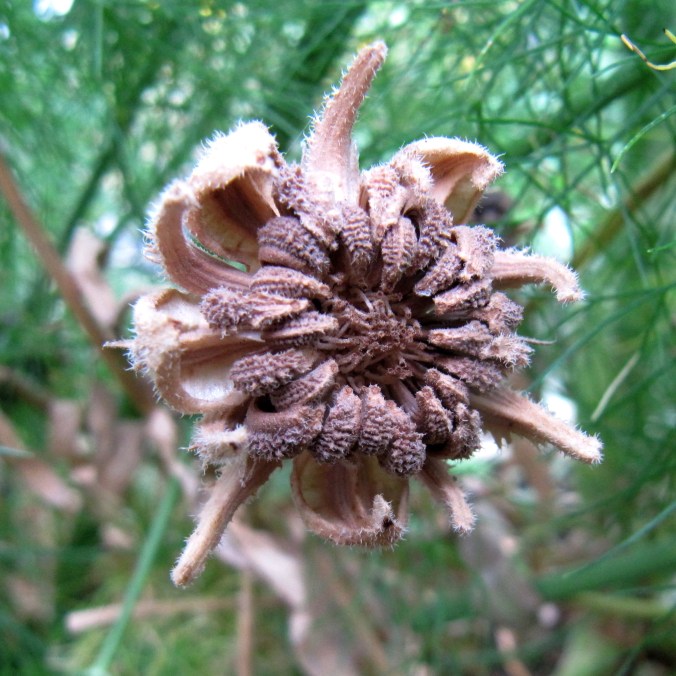 Außerdem bietet es sich an, das Saatgut für den nächsten Frühling einfach selbst zu sammeln, anstatt es jedes Jahr neu zu kaufen. Um Saatgut für zu sammeln, reicht es aus, einige Blüten verblühen und im Beet vertrocknen zu lassen. Das Saatgut der Ringelblumen ist recht groß und wie kleine Sicheln gebogen. An den vertrockneten Blüten lässt es sich gut erkennen und absammeln. Damit es auch ganz wirklich trocken ist, lasse ich das gesammelte Saatgut noch einige Zeit in einem offenen Karton im Schatten liegen. Zum Schluss in eine beschriftete Papiertüte schütten und auf den nächsten Frühling warten. Fertig!