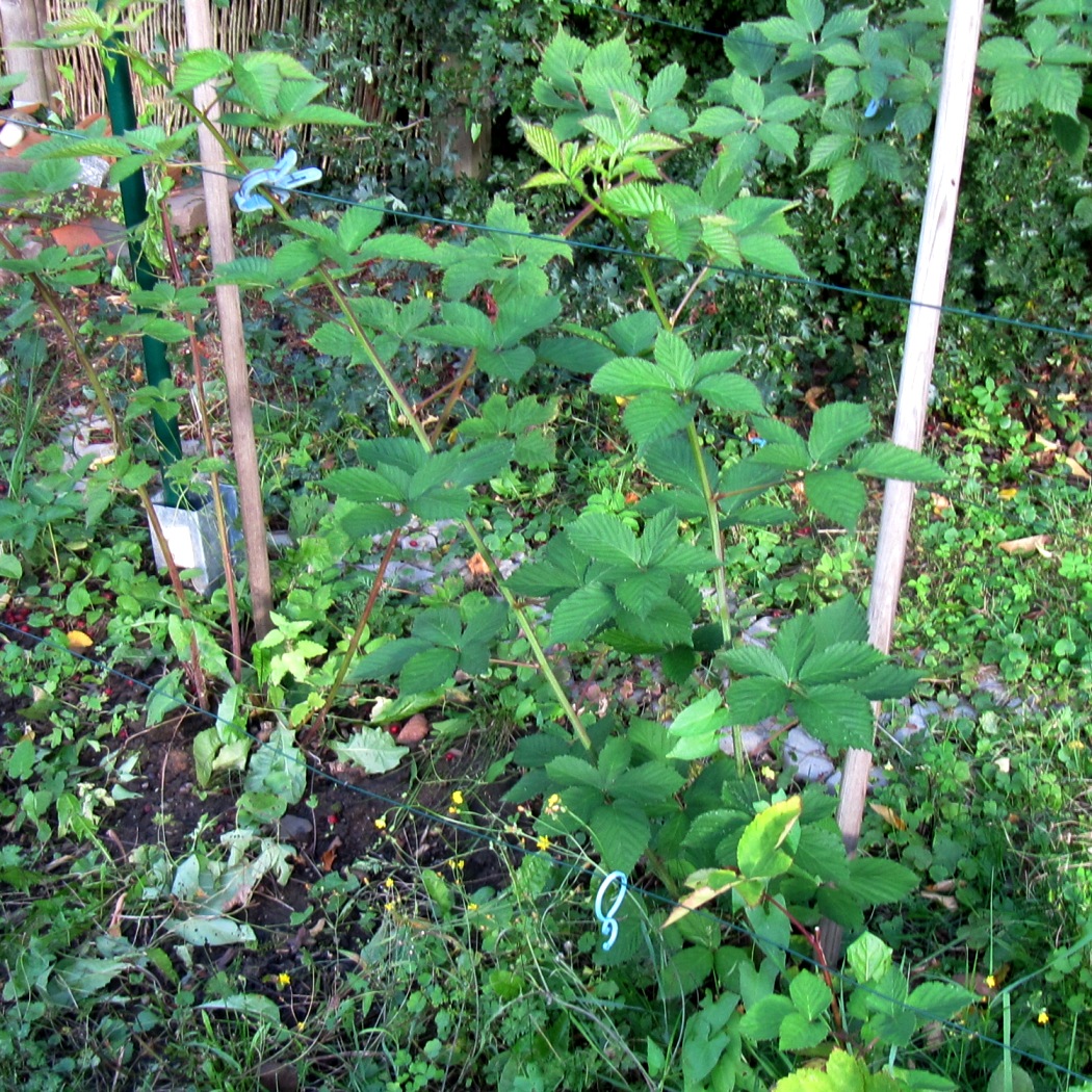 Am Anfang des Jahres gab es etwa 15 lange Triebe. Diese Triebe blühten und trugen Früchte. Im Laufe des Jahres bildeten sich ganz langsam, über die Monate hinweg, weitere ebensolange Triebe ohne Blüten. Jetzt im Herbst bilden beide Arten von Trieben, zusammen mit der ungefragt wuchernden Prunkwinde den Anfang für ein prima Gestrüpp. Ich schneide daher wie geplant, alle Triebe ab, an denen ich diesen Sommer geerntet habe.