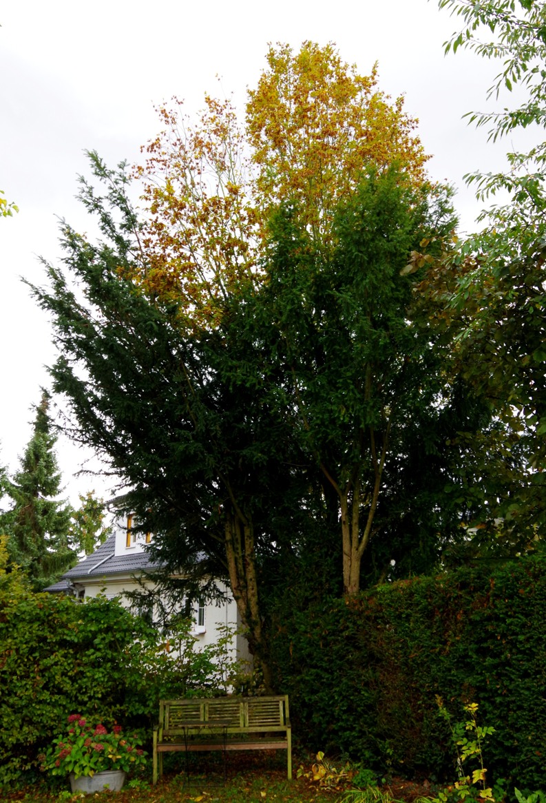 Der zweite Hausbaum teilt sich die Krone mit einer Hainbuche. Im Sommer sieht es aus, als sei es ein einziger hoher Baum. Im Herbst zeigt sich, dass es insgesamt drei Bäume sind: Zwei Eiben und eine Hainbuche. Alle drei nutzen über viele Jahre hinweg die Gunst der Abgeschiedenheit der Gartenecke sowie das hohe Alter aller anliegenden Grundstückseigentümer und enteilen ihren jeweiligen Hecken nach oben. Mittlerweile sind die Grundstücke verkauft, die Häuser renoviert und neu bezogen, aber keiner der neuen Eigentümer mag die Bäume auf die Höhe der Hecke zurückschneiden. Zum Glück!