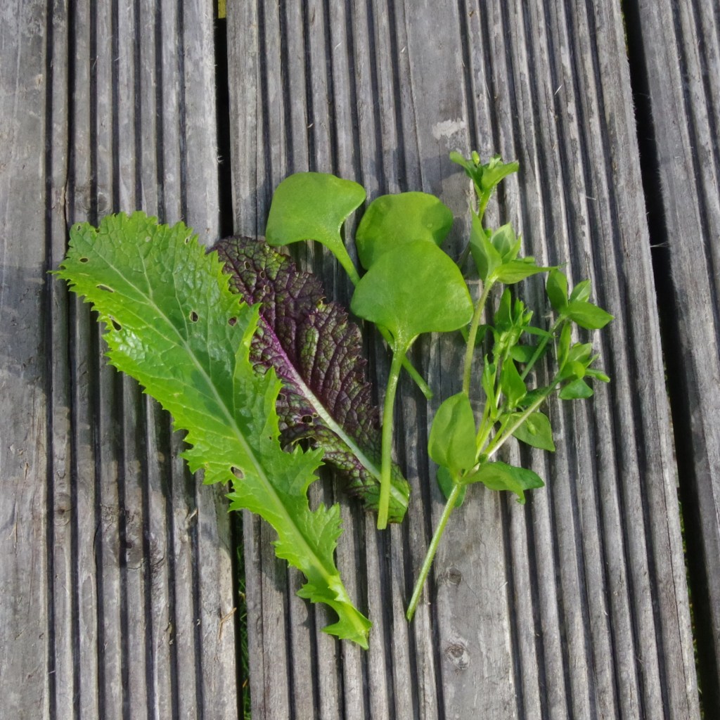 Postelein und Vogelmiere haben den ganzen Winter über durchgehalten. An frostfreien Tagen konnte ich die Supermarktsalate damit ergänzen. Bei den Asia-Salaten (Green in Snow, Red Giant) war ich mir im Winter nicht sicher, ob sie noch etwas taugen. Aber sie sind beide gut durch den Winter gekommen und beginnen wieder zu wachsen.