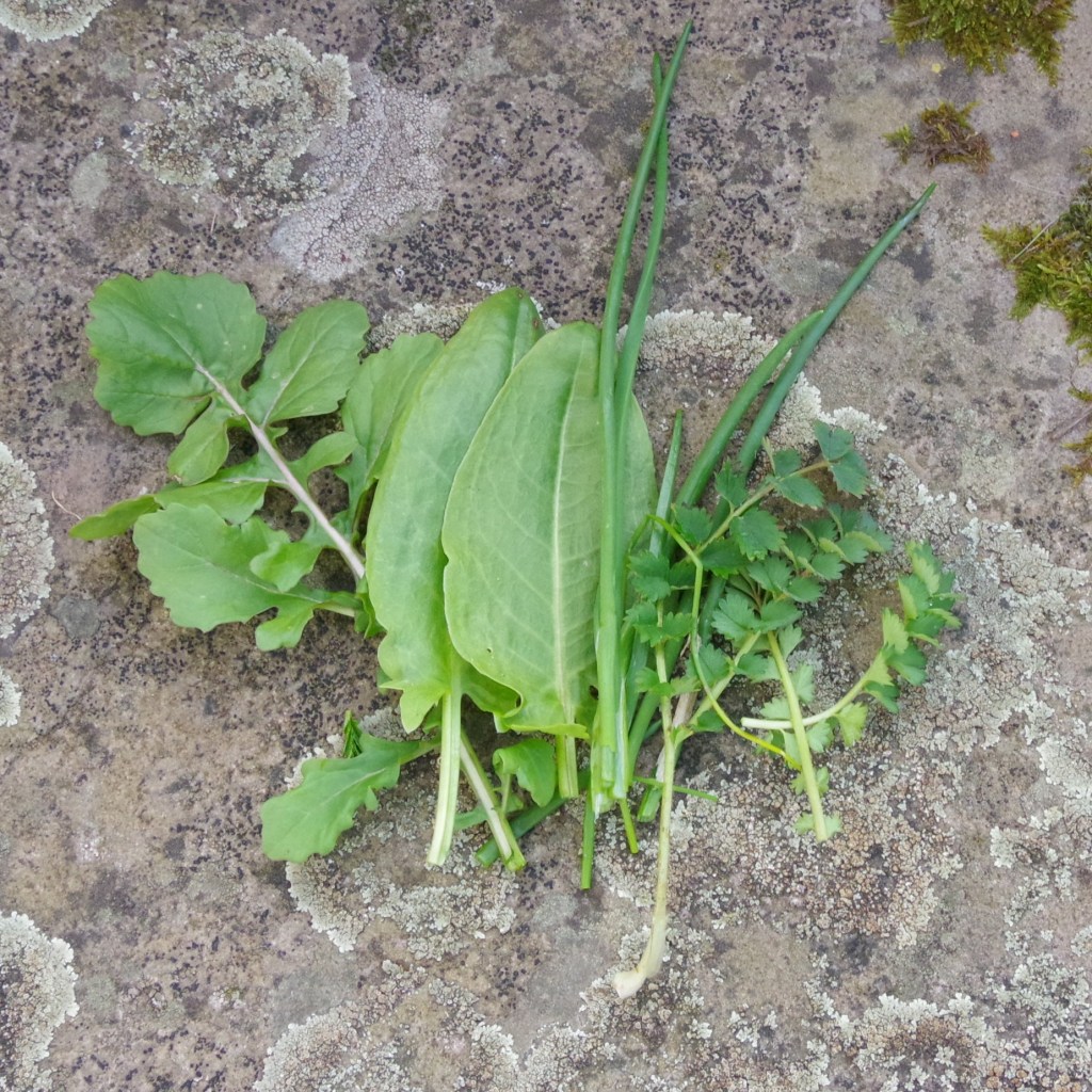 Der Sauerampfer treibt schon neu aus. Sauerampfer habe ich gezielt angesiedelt und zähle ihn deshalb nicht zu den Wildkräutern. Die Grenze zwischen Wildkräutern und Kultursalaten ist bei vielen der wilden Salate eher vage. Auch der Schnittlauch treibt neu aus. Während die Pimpinelle den ganzen Winter über da blieb. Pimpnelle hatte ich bisher nicht auf der Liste der Winterharten.