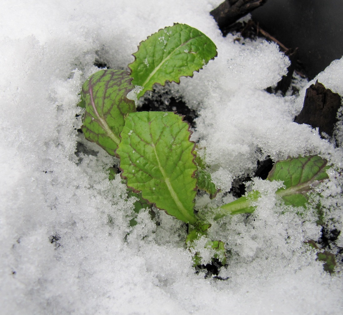 Spät im letzten Jahr hatte ich noch Feldsalat und den Asia Salat Red Giant gesät. Nun liegt eine dünne Schicht Schnee auf den frisch gekeimten Blättchen. Wenn ich den Schnee vorsichtig zur Seite kratze, kann ich sie sehen.